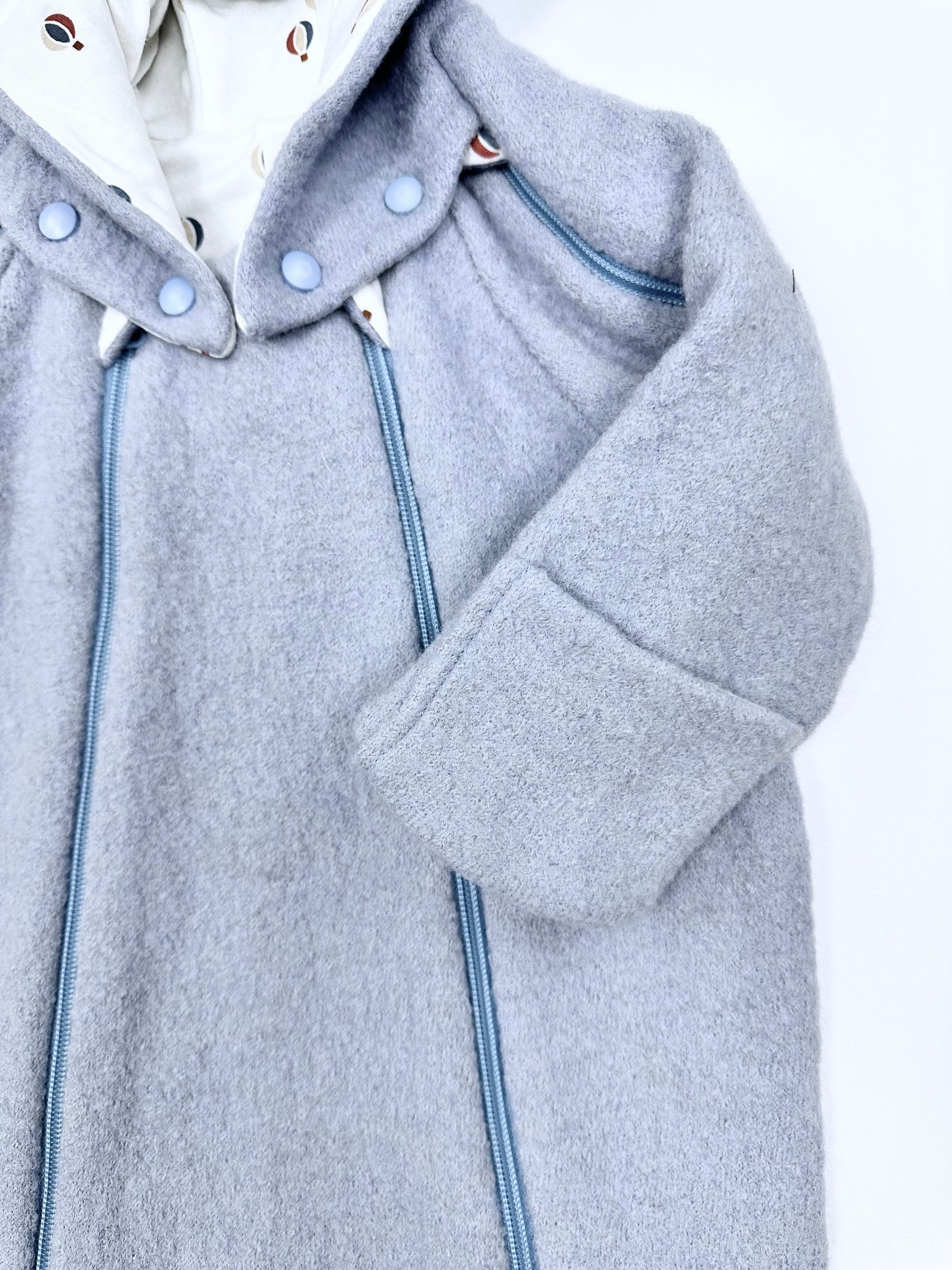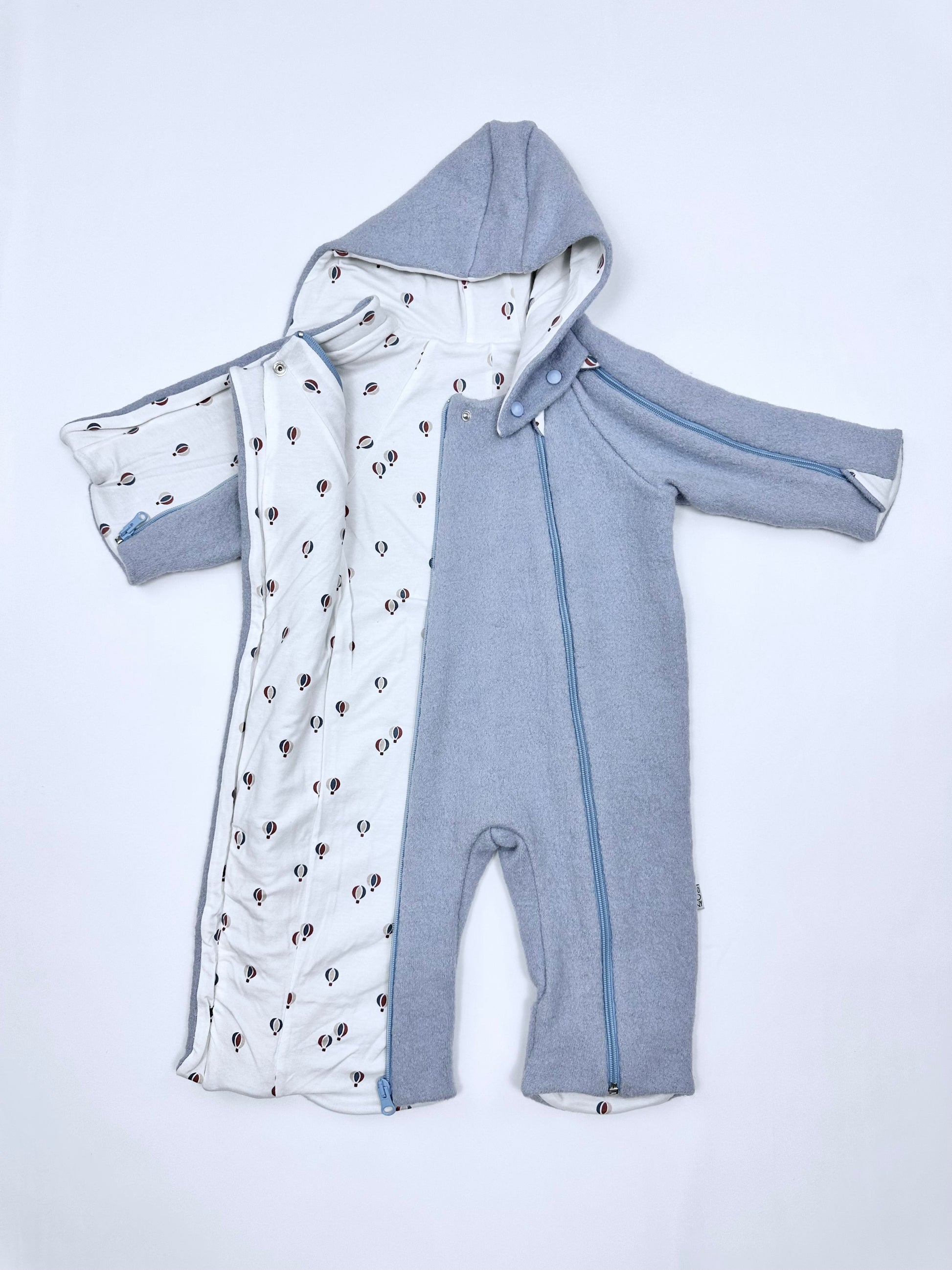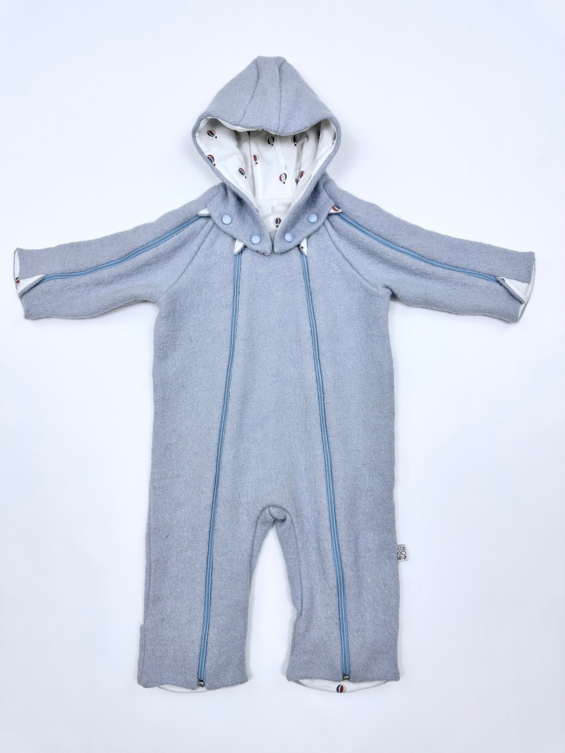 Baby blue outdoor overall in boiled wool with cotton lining.